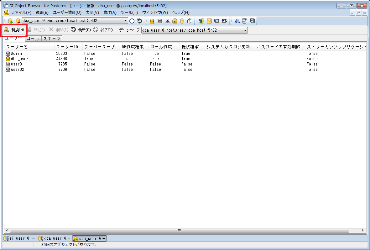 今回はSI Object Browser for Postgresを使用して、ユーザーを作成してみようと思います。