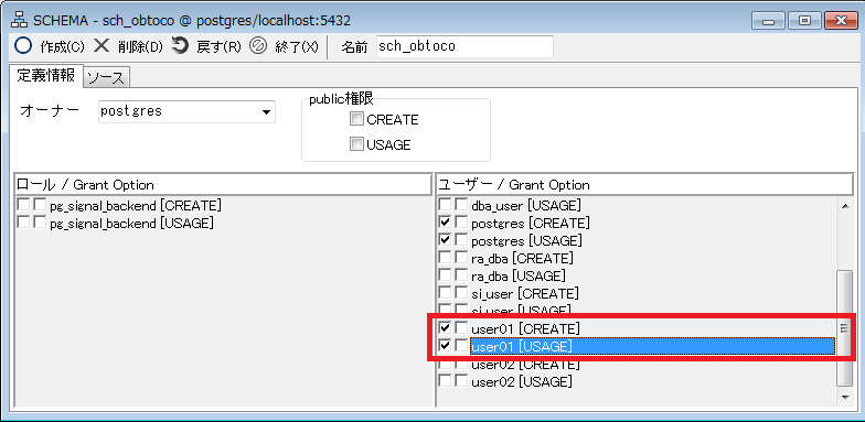 管理者用のユーザーは上記に加え、ロール特権グループのチェックを入れて作成します。スキーマに対しての権限はスーパーユーザであれば設定不要です。