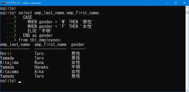 「gender」の値により、表示内容が変更されていることが確認できます。CASE句にAS句を使用し別名に変更してSELECTの結果を見やすくしています。