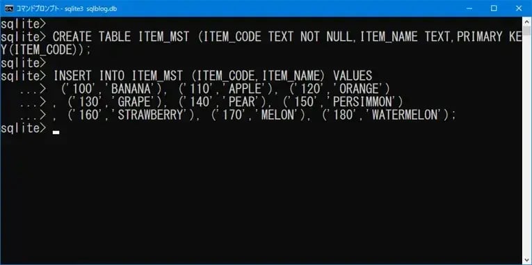 | INSERT INTO ITEM_MST (ITEM_CODE,ITEM_NAME) VALUES ('100','BANANA'), ('110','APPLE'), ('120','ORANGE') , ('130','GRAPE'), ('140','PEAR'), ('150','PERSIMMON') , ('160','STRAWBERRY'), ('170','MELON'), ('180','WATERMELON'); |