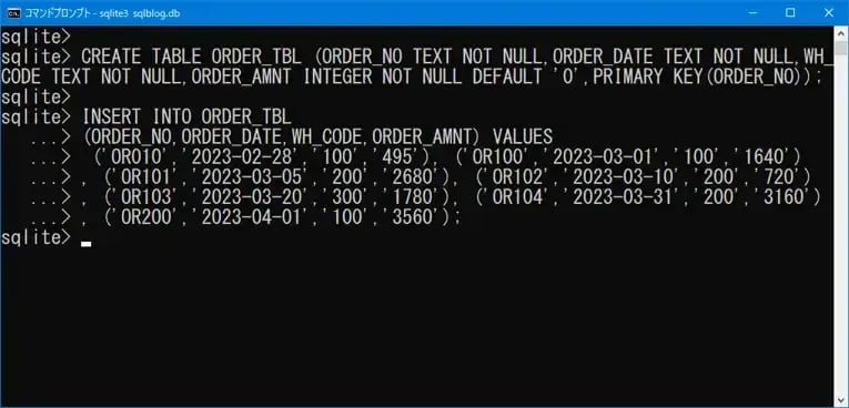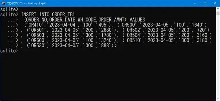 | INSERT INTO ORDER_TBL (ORDER_NO,ORDER_DATE,WH_CODE,ORDER_AMNT) VALUES ('OR010','2023-02-28','100','495'), ('OR100','2023-03-01','100','1640') , ('OR101','2023-03-05','200','2680'), ('OR102','2023-03-10','200','720') , ('OR103','2023-03-20','300','1780'), ('OR104','2023-03-31','200','3160') , ('OR200','2023-04-01','100','3560'); |