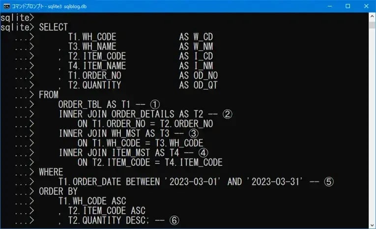 ⑤ BETWEEN句で2023年3月の受注データを絞り込んでいます。