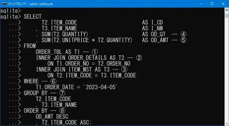 ⑦ 商品コードと商品名をGROUP BY句でグルーピングしています。(表示項目に商品名が含まれているため、ここでも商品名を指定しています。表示項目に商品名が指定されていない場合は、商品名は不要です。)