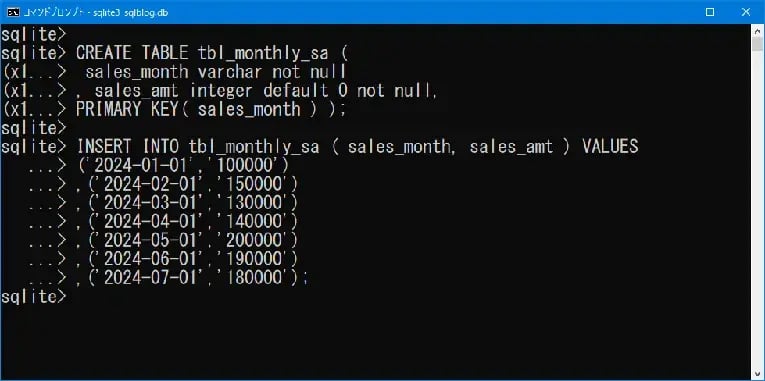 | NSERT INTO tbl_monthly_sa ( sales_month, sales_amt ) VALUES ('2024-01-01','100000') ,('2024-02-01','150000') ,('2024-03-01','130000') ,('2024-04-01','140000') ,('2024-05-01','200000') ,('2024-06-01','190000') ,('2024-07-01','180000'); |