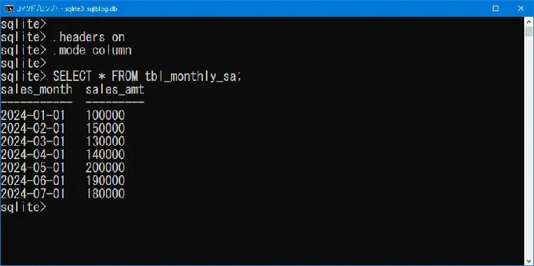 .headers on (ヘッダ情報を出力) SELECT * FROM tbl_monthly_sa; |