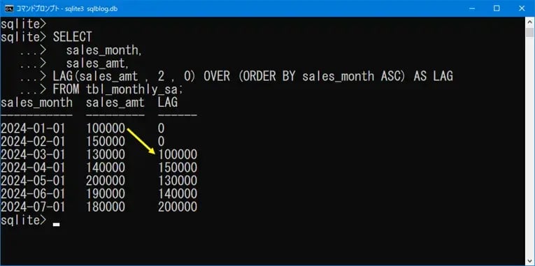 | SELECT sales_month, sales_amt, LAG(sales_amt , 2 , 0) OVER (ORDER BY sales_month ASC) AS LAG FROM tbl_monthly_sa; |