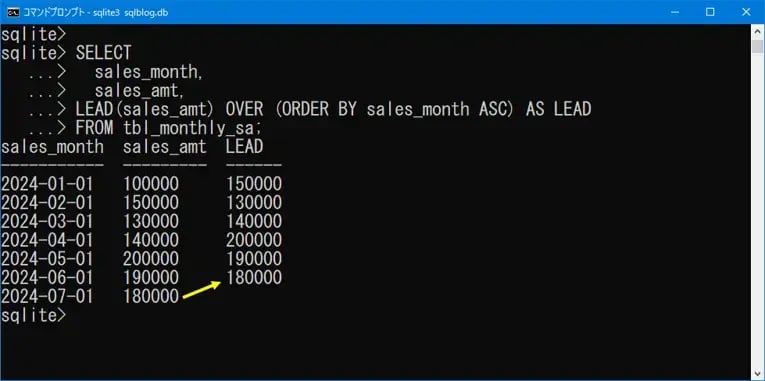 LEAD関数は、現在の行から指定された位置(行数)だけ後の行の値を取得するために使用されます。LAG関数とは反対に、対象の月の売上と次月の売上を比較するような場合に便利です。
