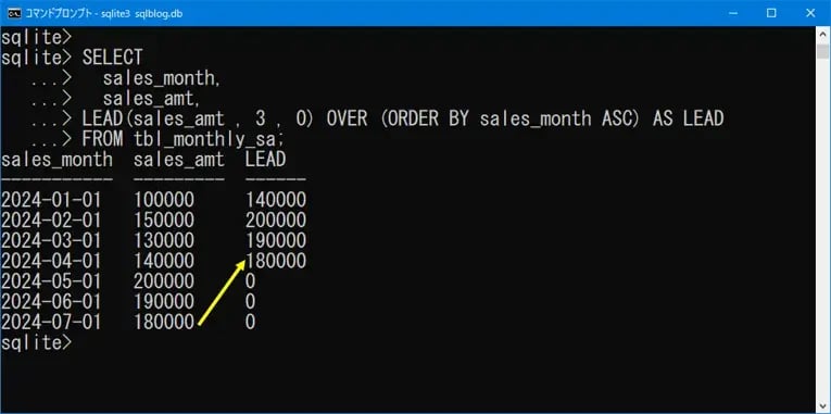 | SELECT sales_month, sales_amt, LEAD(sales_amt , 3 , 0) OVER (ORDER BY sales_month ASC) AS LEAD FROM tbl_monthly_sa; |