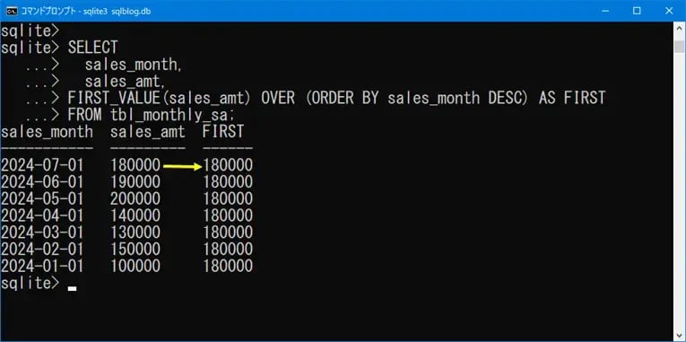 | SELECT sales_month, sales_amt, FIRST_VALUE(sales_amt) OVER (ORDER BY sales_month ASC) AS FIRST FROM tbl_monthly_sa; |