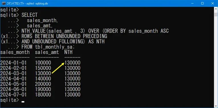| SELECT sales_month, sales_amt, NTH_VALUE(sales_amt , 3) OVER (ORDER BY sales_month ASC ROWS BETWEEN UNBOUNDED PRECEDING AND UNBOUNDED FOLLOWING) AS NTH FROM tbl_monthly_sa; |