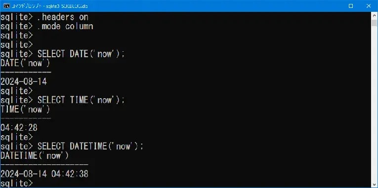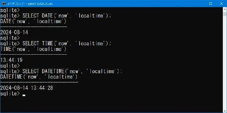 | ・現在のローカル日付を取得する。 SELECT DATE('now', 'localtime'); ・現在のローカル時間を取得する。 SELECT TIME('now', 'localtime'); ・現在のローカル日時を取得する。 SELECT DATETIME('now', 'localtime'); |