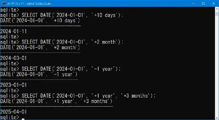 | ・指定した日付の10日後を取得する。 SELECT DATE('2024-01-01', '+10 days'); ・指定した日付の2カ月後を取得する。 SELECT DATE('2024-01-01', '+2 month'); ・指定した日付の1年前を取得する。 SELECT DATE('2024-01-01', '-1 year'); ・指定した日付の1年3カ月後を取得する。 SELECT DATE('2024-01-01', '+1 year', '+3 months'); |