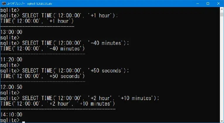 | ・指定した時間の1時間後を取得する。 SELECT TIME('12:00:00', '+1 hour'); ・指定した時間の40分前を取得する。 SELECT TIME('12:00:00', '-40 minutes'); ・指定した時間の50秒後を取得する。 SELECT TIME('12:00:00', '+50 seconds'); ・指定した時間の2時間10分後を取得する。 SELECT TIME('12:00:00', '+2 hour', '+10 minutes'); |