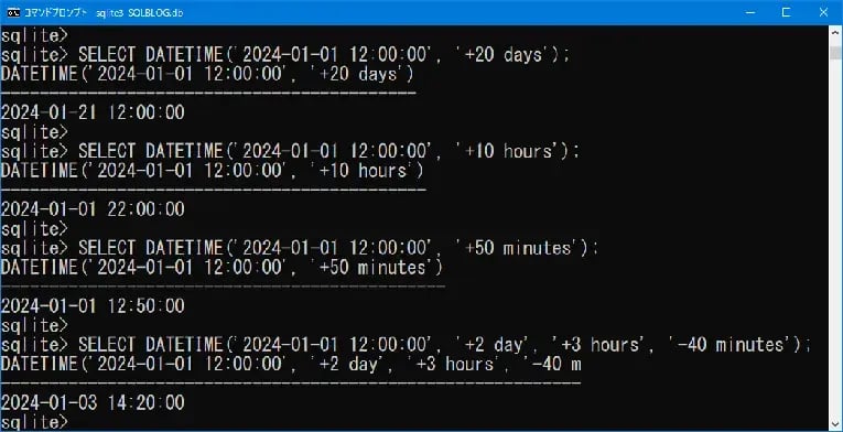 | ・指定した日時の20日を取得する。 SELECT DATETIME('2024-01-01 12:00:00', '+20 days'); ・指定した日時の10時間後を取得する。 SELECT DATETIME('2024-01-01 12:00:00', '+10 hours'); ・指定した時間の50分後を取得する。 SELECT DATETIME('2024-01-01 12:00:00', '+50 minutes'); ・指定した日時の2日後の2時間20分後を取得する。 SELECT DATETIME('2024-01-01 12:00:00', '+2 day', '+3 hours', '-40 minutes'); |