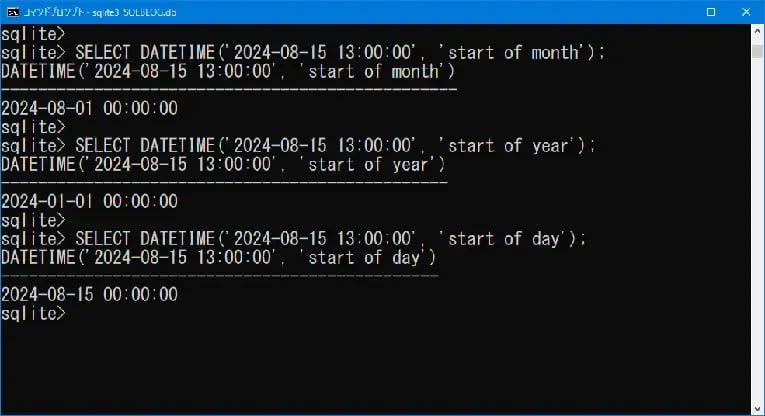 | ・指定した日時の月初日時を取得する。 SELECT DATETIME('2024-08-15 13:00:00', 'start of month'); ・指定した日時の年初日時を取得する。 SELECT DATETIME('2024-08-15 13:00:00', 'start of year'); ・指定した日時の日付の始まり日時を取得する。 SELECT DATETIME('2024-08-15 13:00:00', 'start of day'); |