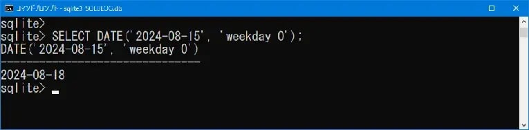 | ・指定した日付から、次の日曜日を取得する。 SELECT DATE('2024-08-15', 'weekday 0'); ‘weekday’ の後の数字は曜日を指しています。(0:日 1:月 2:火 3:水 4:木 5:金 6:土) |
