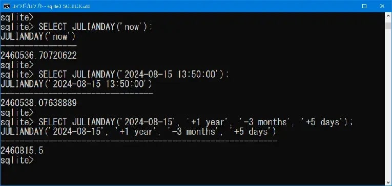 | ・現在日時をユリウス日に変換した値を取得する。 SELECT JULIANDAY('now'); ・指定した日時をユリウス日に変換した値を取得する。 SELECT JULIANDAY('2024-08-15 13:50:00'); ・指定した日付から1年を加え、その3カ月前、さらに5日を加えた日付をユリウス日に 変換した値を取得する。 SELECT JULIANDAY('2024-08-15', '+1 year', '-3 months', '+5 days'); |