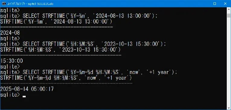 | ・指定した日時から年月を取得する。 SELECT STRFTIME('%Y-%m', '2024-08-13 13:00:00'); ・指定した日時から、時分秒を取得する。 SELECT STRFTIME('%H:%M:%S', '2023-10-13 15:30:00'); ・現在日時の1年後の日時を取得する。 SELECT STRFTIME('%Y-%m-%d %H:%M:%S', 'now', '+1 year'); |