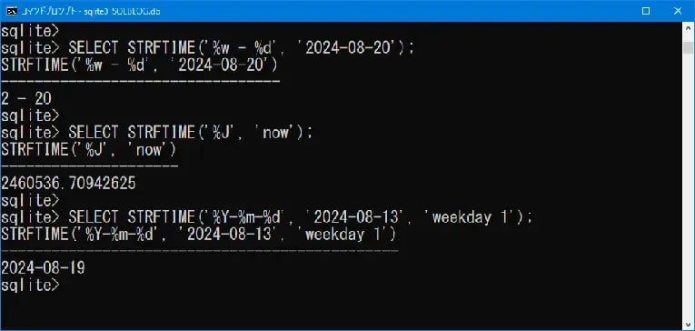 | ・指定した日時から曜日と日付を取得する。 SELECT STRFTIME('%w - %d', '2024-08-20'); ・現在日時から、ユリウス日を取得する。 SELECT STRFTIME('%J', 'now'); ・指定した日付の次の月曜日を取得する。 SELECT STRFTIME('%Y-%m-%d', '2024-08-13', 'weekday 1'); |