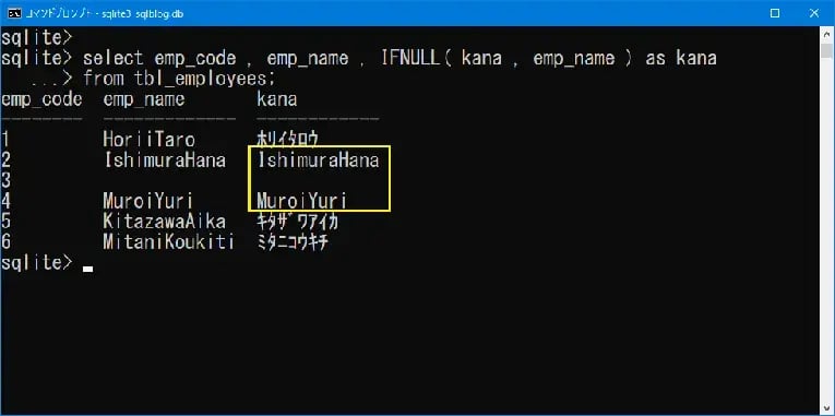 それでは、IFNULL関数を使用して、「kana」がNULLの場合は「emp_name」を表示するSELECT文を試してみましょう。
