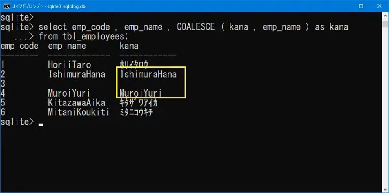 | select emp_code , emp_name , COALESCE ( kana , emp_name ) as kana from tbl_employees; |