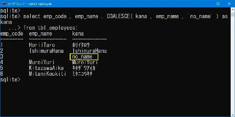 それでは次に、「kana」、「emp_name」の両方がNULLの場合は「no_name」という文字を表示するSELECT文を確認してみましょう。