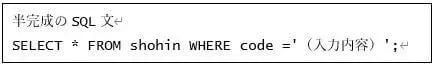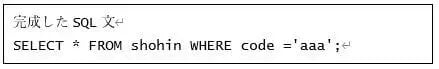 すると、システムはaaaという情報を受け取り、それをあらかじめ準備してあった半完成のSQL文に連結して一つのSQLを生成します。半完成のSQL文とは以下のイメージです。
