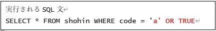 お分かりでしょうか?論理式的にOR TRUEが勝ってしまい、code = 'a'は無視されます。aでもbでも一緒です。SQL文全体としては、検索条件がかかっていないのと同じ意味になり、商品マスタの全レコードが返却されます。商品マスタだからまだマシですが、これがユーザ情報となると、大変ですよね。