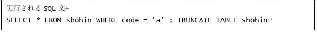 最初のセミコロン「;」で文が分かれます。前半のSELECT文が実行されたあと、後半のTRUNCATE文が実行されて、何と商品マスタをすべて消してしまいます。Webサイトやその運営会社に強い恨みを持つ人ならやりかねませんね(笑)