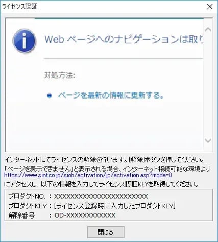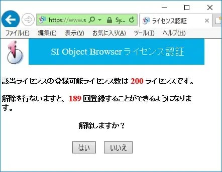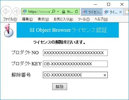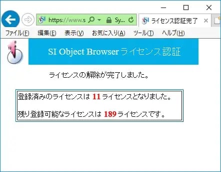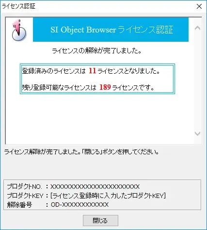 以上で製品登録の解除は完了です。製品解除後、別のプロダクトKEYでライセンス登録する場合は再度SI Object Browserを起動し、製品登録を行ってください。同マシンにて製品を利用しない場合は、製品のアンインストールを行ってください。