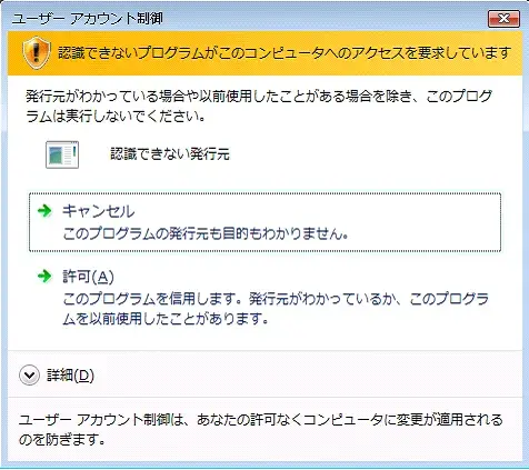 OSがVista以降の場合は、インストールが開始された時点で下のような画面が表示されますので、