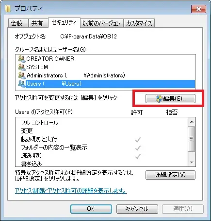 フォルダプロパティのセキュリティタブより[Users]を選択し、