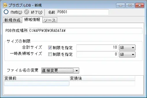 作成]ボタンを押すと表領域を変更することが出来ます。