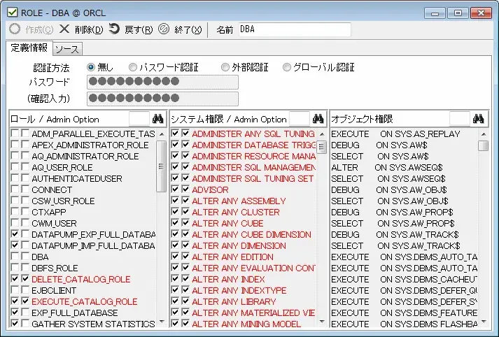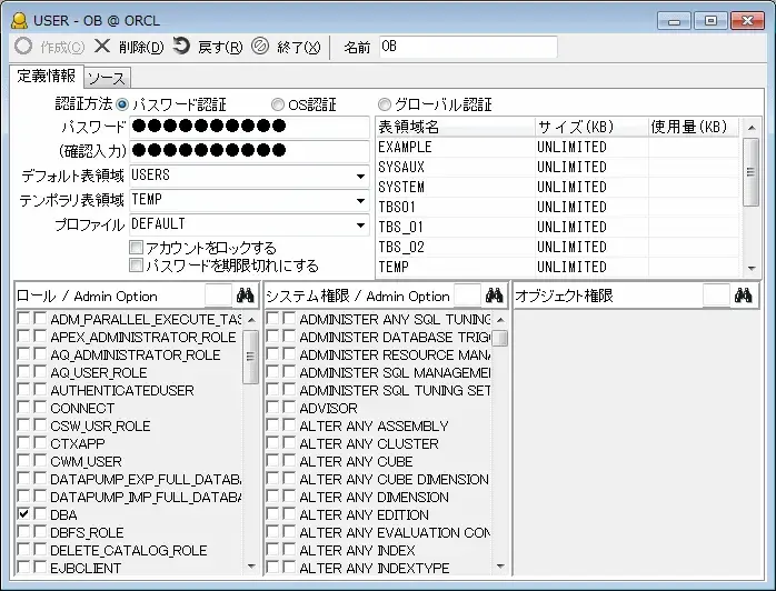 画面下段にはそのユーザーのロール、システム権限、オブジェクト権限が表示され、それぞれの値を修正する事が出来ます。