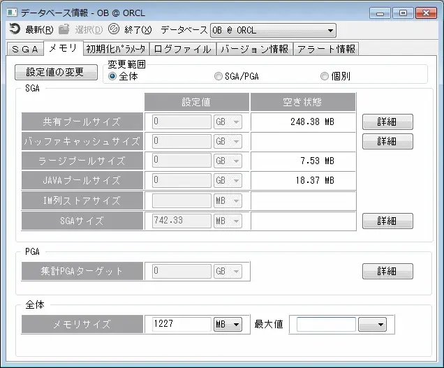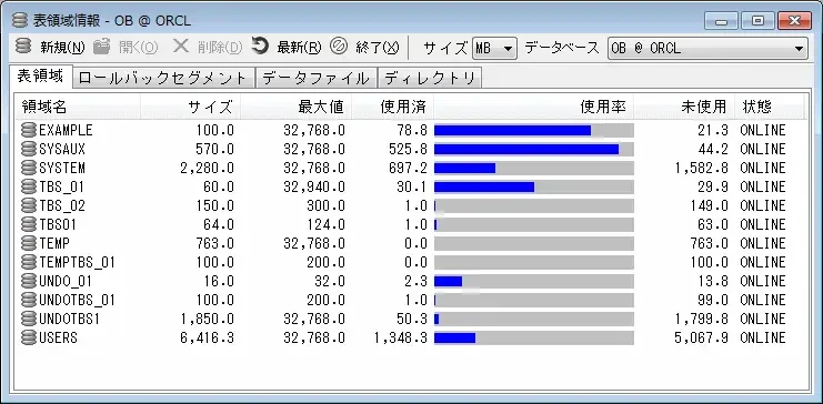 画面上段右側には表領域別の使用可能サイズの設定、また現時点の使用量が確認できます。