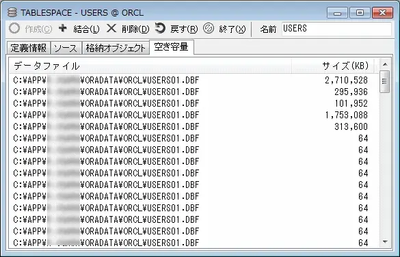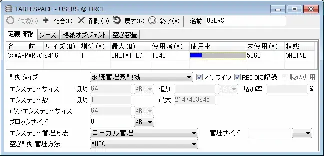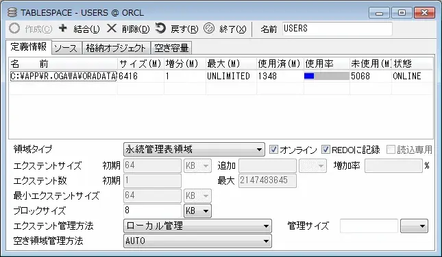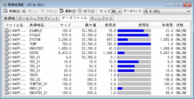 画面上段にはその表領域を構成するデータファイルの名前及びサイズ・拡張方法が、