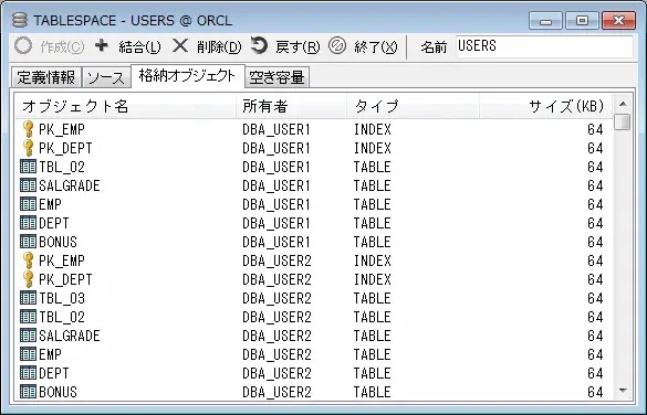 表領域に格納されているデータベースオブジェクトを一覧表示します。
