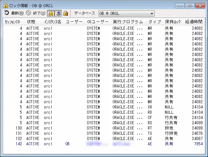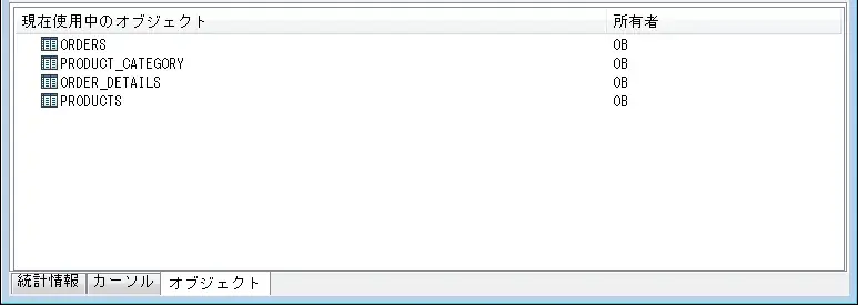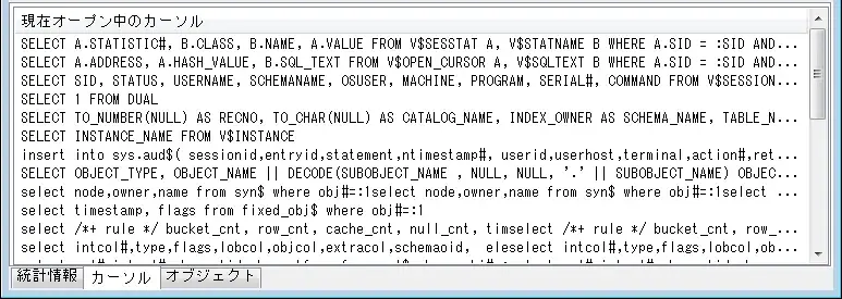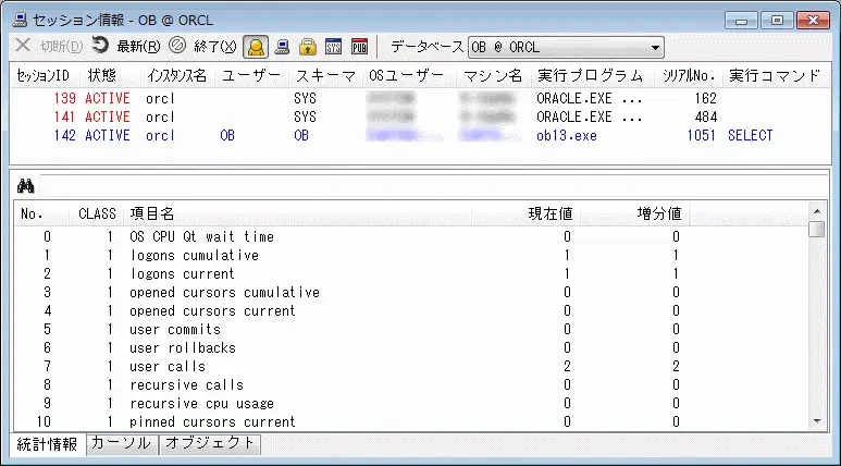 画面下段には選択したセッションのオープンカーソル、使用オブジェクト、統計情報が表示されます。