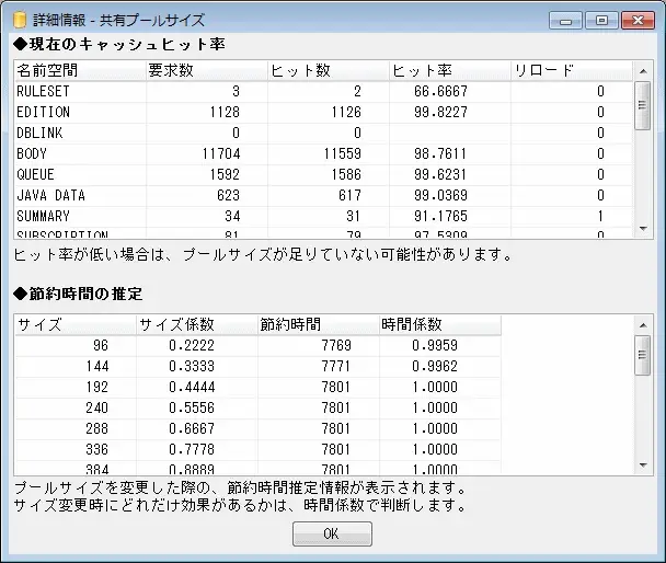 V$SGA_TARGET_ADVICEビューの情報をもとに、 共有プールのサイズ設定に関するアドバイスを提供します。 |