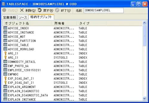 表スペースに格納されているデータベースオブジェクトを一覧表示します。