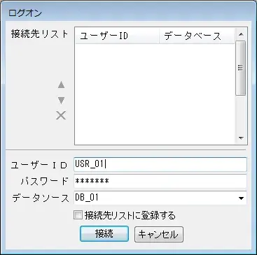 SI Object Browser for Symfowareを起動し、 「データベース」のコンボボックスにて⑥で設定したデータソース名が選択できることを確認してください。 その後、ユーザーID、パスワードを入力し、データベース接続できることをご確認ください。