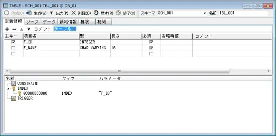 下に移動]ボタンで、項目情報の順番を変更することができます。下段にはこのテーブルに従属するインデクス、トリガー、制約が一覧表示されます。
