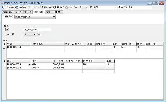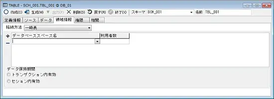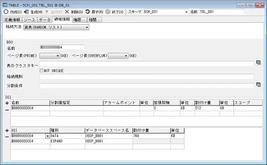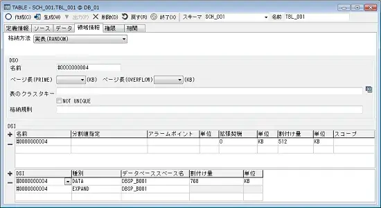 領域情報には、[標準]、[実表(SEQUENTIAL)]、[実表(SEQUENTIAL リスト)]、 [実表(SEQUENTIAL レンジ)]、[実表(RANDOM)]、[実表(RANDOM リスト)]、 [実表(RANDOM レンジ)]、[実表(RANDOM レンジ)]、[実表(OBJECT)]、[一時表] があります。