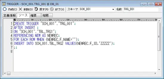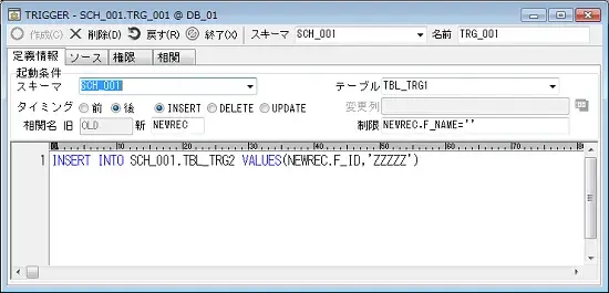 トリガーの起動条件を上段に、実行部のSQL文を下段に表示します。