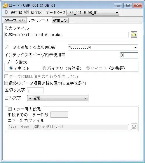 読み込ませたいファイルとデータを取り込みたい表のDSI名を指定します。