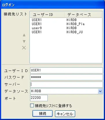 サーバ・ポートについてユーザー情報画面を除く各管理機能(RDエリア情報・セッション情報・ロック情報・ データベース情報・バックアップ・復元・ロード)のご利用になる際、 以下の二つの項目を入力する必要が有ります。 [サーバー] 接続するデータベースサーバー名を入力します。 ※ここで入力されたサーガー名は、RDエリア情報などのDBA画面で使用します。 (接続の際はODBCデータソースで設定したサーバー名が優先されます。) [ポート] データベースに接続する際のポート番号を入力します。 ※ここで入力されたポート番号は、RDエリア情報などのDBA画面で使用します。 (接続の際はODBCデータソースで設定したサーバー名が優先されます。) |