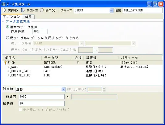 通常のデータ投入方式でデータを生成します。 作成件数は、生成するデータの件数を入力します。 |