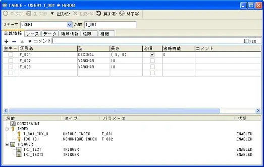 下に移動]ボタンで、項目情報の順番を変更することができます。下段にはこのテーブルに従属するインデクス、トリガー、制約が一覧表示されます。