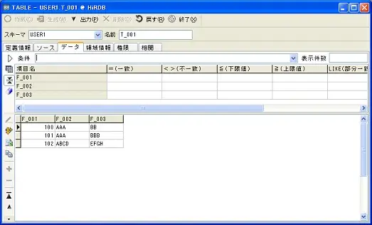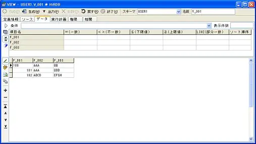 画面上段にある[条件]テキストボックスはデータの抽出条件を記述する事ができます。