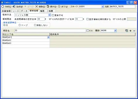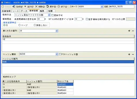 領域情報には、[標準]、[キーレンジ分割]、[境界値指定]、 [マトリクス分割]、[ハッシュ混在マトリクス分割]、[ハッシュ分割] があります。